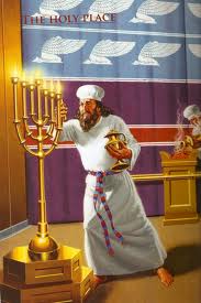 In the first apartment, or holy place, were the table of showbread, the candlestick, or lampstand, and the altar of incense. The table of showbread stood on the north. With its ornamental crown, it was overlaid with pure gold. On this table the priests were each Sabbath to place twelve cakes, arranged in two piles, and sprinkled with frankincense. The loaves that were removed, being accounted holy, were to be eaten by the priests. On the south was the seven-branched candlestick, with its seven lamps. Its branches were ornamented with exquisitely wrought flowers, resembling lilies, and the whole was made from one solid piece of gold. There being no windows in the tabernacle, the lamps were never all extinguished at one time, but shed their light by day and by night. Just before the veil separating the holy place from the most holy and the immediate presence of God, stood the golden altar of incense. Upon this altar the priest was to burn incense every morning and evening; its horns were touched with the blood of the sin offering, and it was sprinkled with blood upon the great Day of Atonement. The fire upon this altar was kindled by God Himself and was sacredly cherished. Day and night the holy incense diffused its fragrance throughout the sacred apartments, and without, far around the tabernacle.